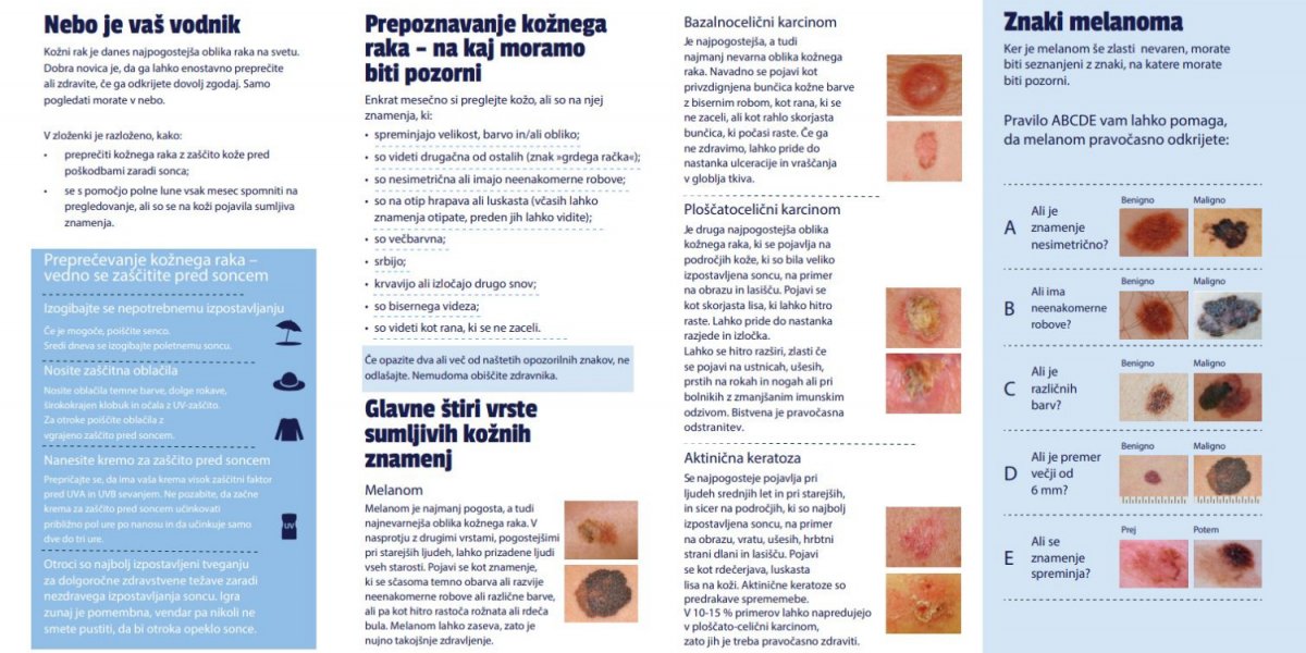 Kožni rak je danes najpogostejša oblika raka na svetu. Dobra novica je, da ga lahko enostavno preprečite ali zdravite, če ga odkrijete dovolj zgodaj. V zloženki si lahko preberete, kako preprečiti kožnega raka z zaščito kože pred poškodbami zaradi sonca ter navodila za samopregledovanje.